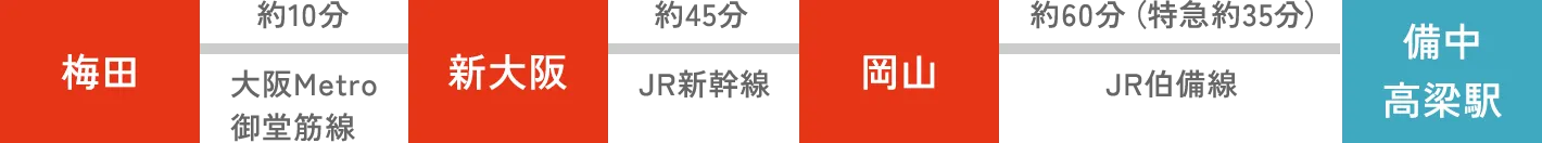 土佐堀通と中之島から阪神高速11号池田線/ルート11に入る/吉備中央町西の国道484号まで中国縦貫自動車道/中国自動車道/吹田山口線/近畿自動車道、山陽自動車道、中国横断自動車道/岡山米子線/岡山自動車道を進み、賀陽ICで中国横断自動車道/岡山米子線/岡山自動車道を出る/高梁市松原通の目的地まで国道484号を進む(約3時間15分)