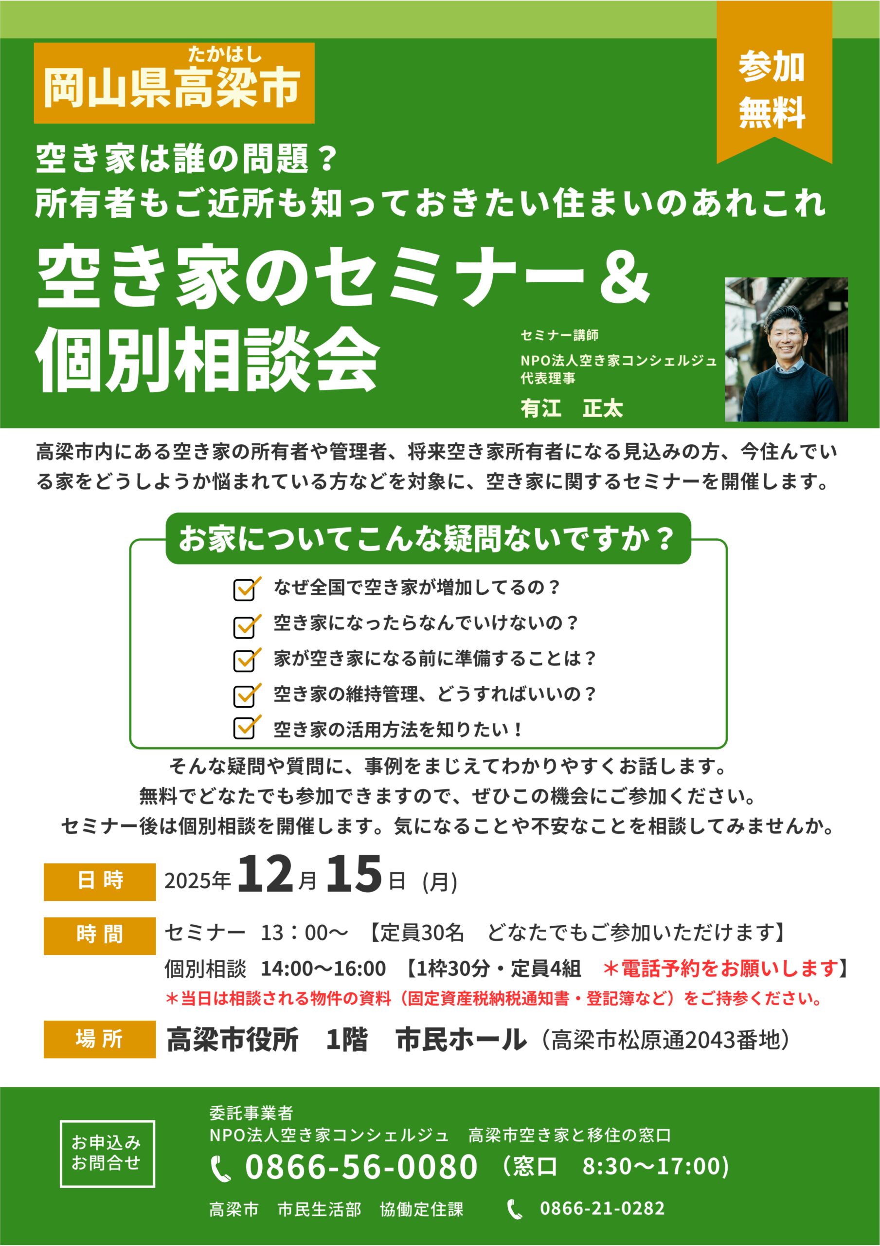 高梁市内にある空き家の所有者や管理者、将来空き家所有者になる見込みの方、今住んでいる家をどうしようか悩まれている方などを対象に、空き家に関するセミナーを開催します。