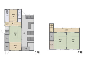 1階:和室6畳、板間3畳×2、DK(土間)、風呂、トイレ