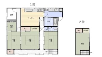 1階:和室(8畳、6畳×2、2畳)、ダイニングキッチン、風呂、トイレ、洗面室 2階:和室(6畳) |
