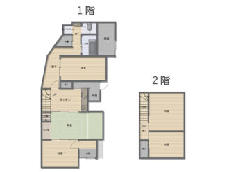 1階:和室、洋室2部屋、台所、風呂、トイレ、物置 2階:洋室2部屋 離れ:洋室、台所、風呂、トイレ、倉庫 |