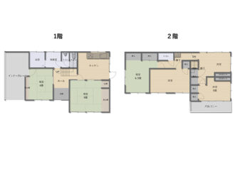 6DK 1階:和室8畳、6畳、ダイニングキッチン、風呂、トイレ、洗面室 2階:洋室3部屋、和室1部屋、トイレ |