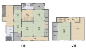 1階:和室5部屋(6畳×2、4.5畳、3畳×2)、板間、ダイニングキッチン、物置、風呂、トイレ 2階:和室(6畳)、洋室 |